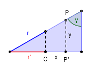 En concreto, tenemos que la coordenada horizontal de P' es \(x=r'cos \alpha\ \ \ \ [2]\). Volviendo a la vista de perfil, sea y la coordenada vertical de P: