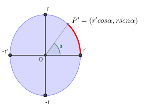 Coordenada vertical de un punto PCalculamos primero las ecuaciones de la elipse. Para ello necesitamos sus semiejes. El semieje mayor es r, es decir, el radio de las bases del cilindro. Mirando el cilindro de perfil vemos el semieje menor, r'. La perspectiva de las imágenes tridimensionales puede engañar, pero r' es menor que r: