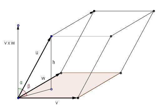 Producto mixto Volumen del paralelepípedo. Volumen del tetraedro (ver imagen). \(|[u,v,w]|=|u·(v \times w)|=\\|u|·|v \times w|·|cos(u,v \times w)|=\\ |v \times w|·|u|·|sen(\beta)|=\\A_b·h= \text{volumen del paralelepípedo}\)