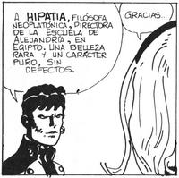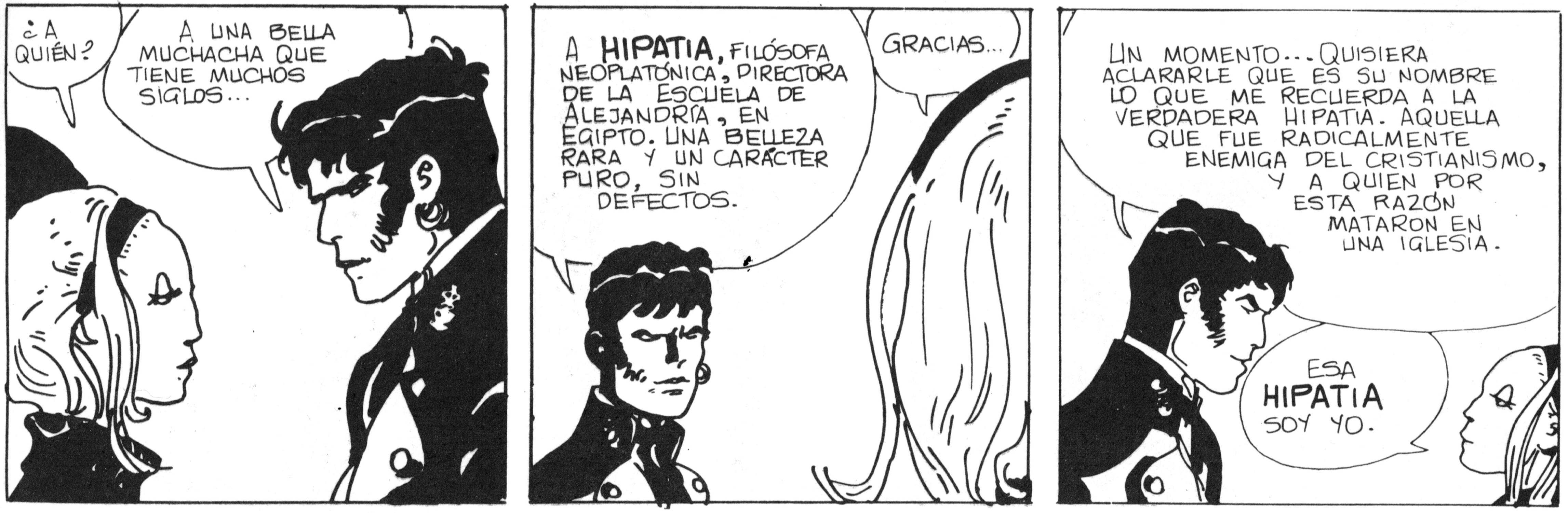 Fábula de VeneciaLas historias de Corto Maltés, el personaje del veneciano Hugo Pratt, se desarrollan en los más diversos lugares del mundo y aparecen en ellas, en una muy literaria confusión, personajes de ficción junto con otros provenientes de la historia, o de otras ficciones. Uno de esos personajes históricos es la alejandrina Hipatia, posiblemente la primera mujer matemática de renombre.