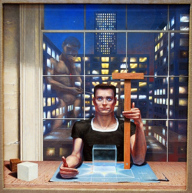 ArquitectoLa imagen es inquietante, en parte por el hieratismo del protagonista, rígido en su gesto facial y en sus manos, que parecen querer adaptarse, como el resto de su cuerpo, al ángulo recto. El cubo transparente que tiene ante él tiene algo de místico por la luz que irradia hacia abajo, y por ser el modelo perfecto de los otros dos cubos que se ven a la izquierda y que resultan mucho más reales por su opacidad y su materilidad. Paul Cadmus es un pintor estadounidense conocido por su desnudos y su temática homosexual, que también aparece en esta obra en el reflejo desnudo que se ve en el ventanal del fondo y que podría ser el propio pintor. La rigidez del modelo contrasta con la pose praxiteliana del observador, en lo que supongo un mensaje acerca de dónde está la realidad. El erotismo contenido del cuadro me recuerda a Los astrónomos de Delvaux. Termino con una curiosidad: en el cubo marrón de la izquierda se ve un signo que recuerda al monograma de Durero.