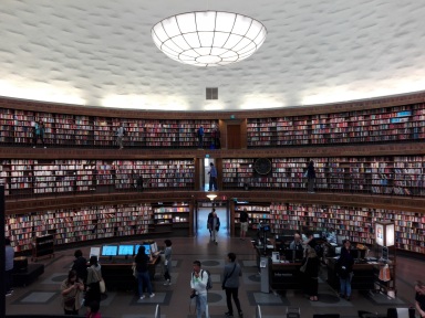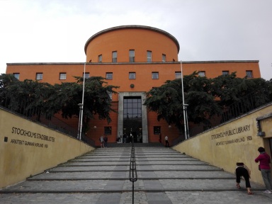 Biblioteca Pública de EstocolmoLa Biblioteca Pública de Estocolmo es obra de Eric Gunnar Asplund. Sobre un ortoedro montó un cilindro que alberga la sala principal de la biblioteca, que consta de tres galerías de estantes a las que se accede por escaleras. La foma cilíndrica logra que la visual sea espectacular desde cualquier punto. Del exterior llama la atención el friso, con elementos de las distintas disciplinas, y de la entrada unos relieves clásicos de especial elegancia. El acceso a la biblioteca y a los libros es completamente libre.