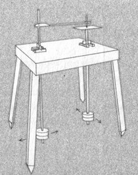 Para simular las vibraciones que los dos diapasones perpendiculares transmiten al rayo de luz, vamos a sustituir ahora la masa del extremo libre del muelle por una plataforma perpendicular al movimiento en la que vamos a fijar un segundo muelle al que unimos una segunda masa.