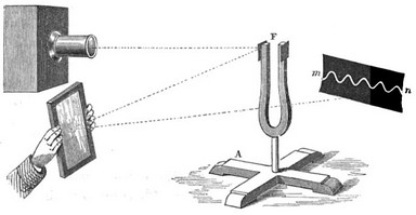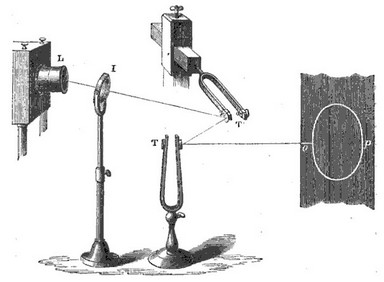 Lissajous hizo varios experimentos para traducir en imágenes movimientos vibratorios. Uno de ellos es el que muestra la figura: colocó en un diapasón un espejito y proyectó sobre él un rayo de luz. Al hacer vibrar el diapasón, el espejito vibró solidariamente con él, y el rayo de luz, al incidir sobre una pantalla, produjo una bonita curva sinusoidal.