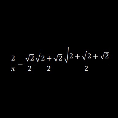 Pi como producto infinito de raíces (Viète)Que el irracional y trascendente valor del número π se pueda calcular echando mano únicamente del dos y de productos, divisiones y raíces cuadradas ya resulta sorprendente. Pero lo más destacable de esta fórmula, debida al matemático francés François Viète, es que en ella, por primera vez, un proceso infinito, simbolizado por esos tres puntos que se ven a la derecha, se indicaba explícitamente en una fórmula matemática. Lo que realmente obtuvo Viète fue \[\dfrac{2}{\pi}=\cos\dfrac{\pi}{4}\cos\dfrac{\pi}{8}\cos\dfrac{\pi}{16}\cos\dfrac{\pi}{32}...\] siendo lo que se ve a la izquierda la forma numérica de lo anterior tras escribir el valor del coseno de pi cuartos y aplicar la fórmula del coseno del ángulo mitad. Pregunta: ¿cuál de las dos fórmulas crees más informativa?