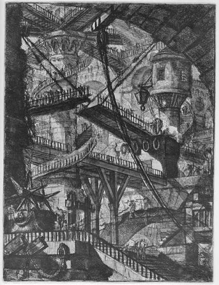 Las cárceles inventadas de PiranesiEl arquitecto y dibujante Giambattista Piranesi publicó en 1760 una serie de litografías titulada Carceri d'invenzione. La riqueza de los detalles, la extraordinaria profundidad de sus interiores y lo laberíntico y opresivo de los lugares que recrea hace que uno no se dé cuenta de que se trata, en muchas ocasiones, de arquitecturas imposibles. Un ejemplo: si nos fijamos en la gran columna situada hacia la izquierda, en la escalera helicoidal que la abraza, y en el puente levadizo a punto de cerrarse, enseguida veremos que algo falla. Bruno Ernst dice que no se sabe si el autor utilizó la imposibilidad de un modo consciente [Adventures with impossible figures, p.78]. A mí se me hace difícil creer que alguien con los conocimientos teóricos y el dominio técnico de Piranesi no supiese exactamente lo que hacía.