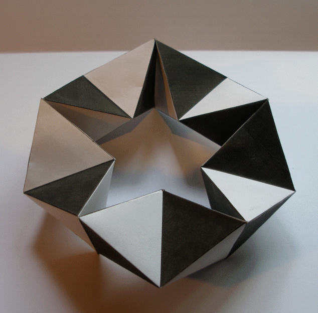 Para los usuarios de GeoGebra incluyo al final una construcción con el desarrollo. Con el deslizador se puede cambiar el tamaño del anillo y con las herramientas de GeoGebra, todo lo demás. En la siguiente fotografía se puede ver un anillo ya montado: he coloreado las caras alternativamente de negro y blanco para resaltar el efecto. Sin duda, lo más llamativo de este poliedro es que pueda girar sobre sí mismo. En la siguiente construcción se ve lo que quiero decir.