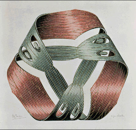 Cinta de Moebius - 2ª parteUn buen día, preparando la visita a una exposición dedicada a M.C. Escher, les conté a mis alumnos de 4º de la ESO que para calcular el número de caras de un superficie un método es pintarla: si podemos hacerlo con un solo color sin saltarnos borde alguno es que tiene una cara. Si necesitamos dos colores, pues dos caras.