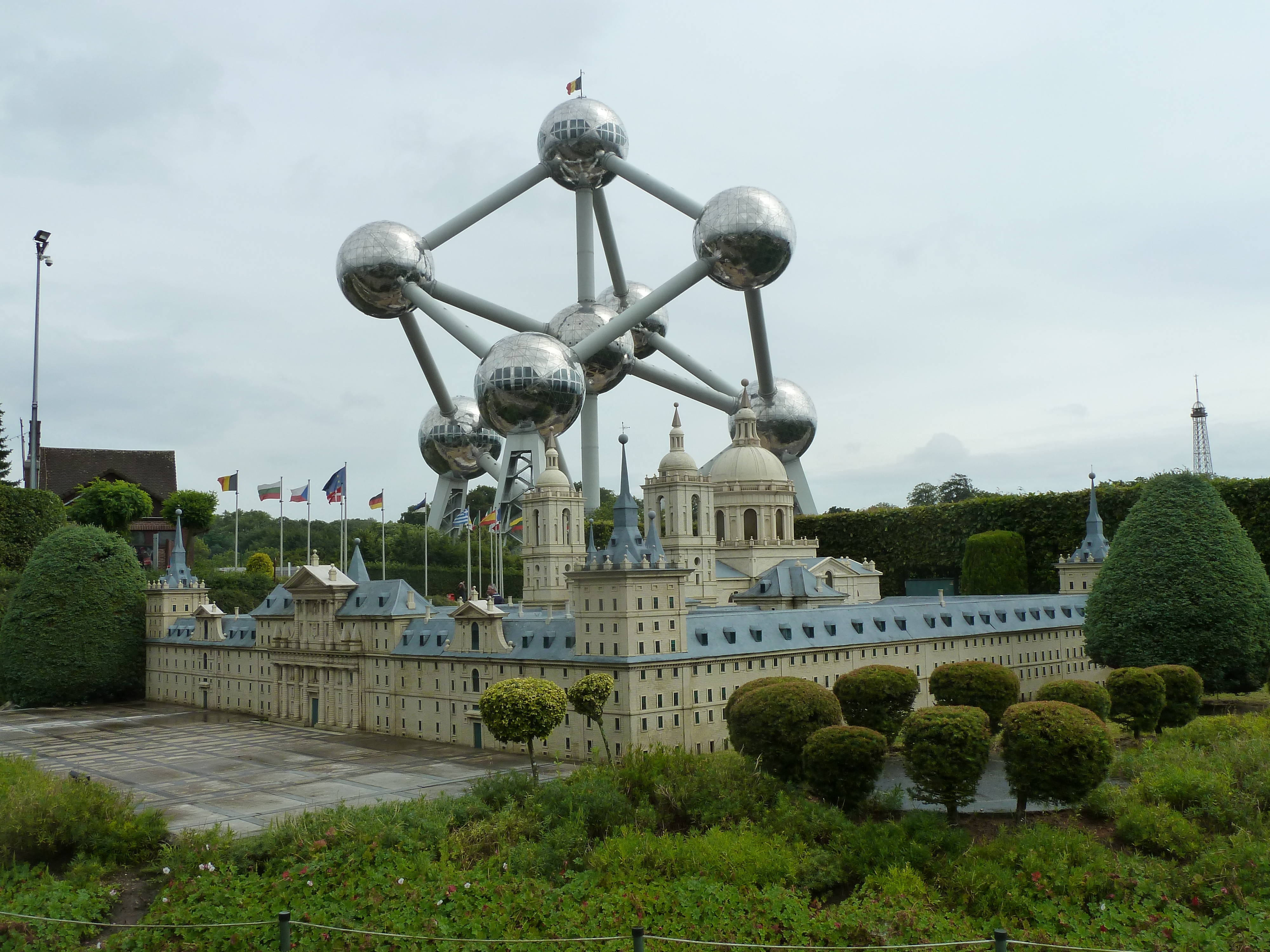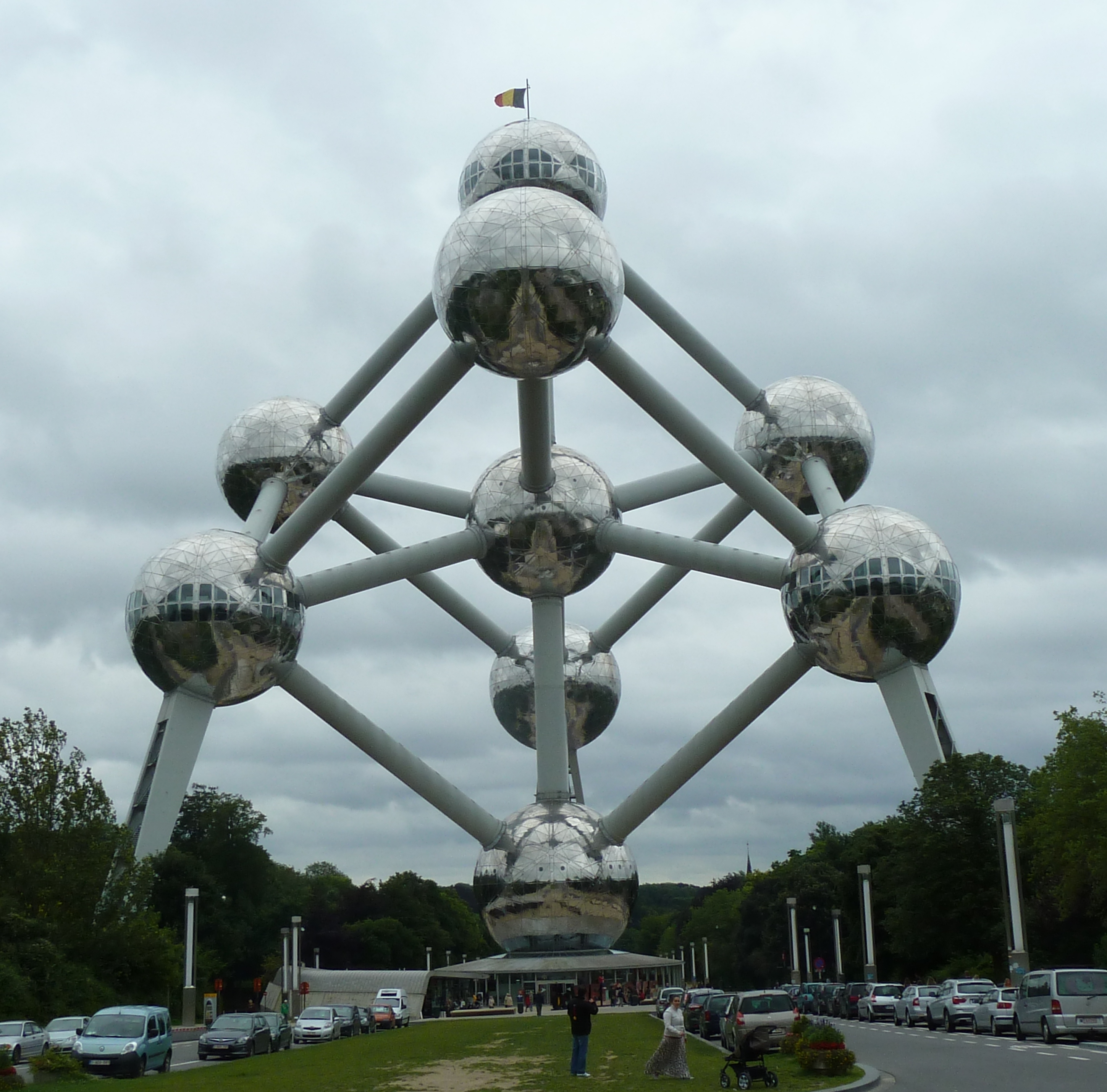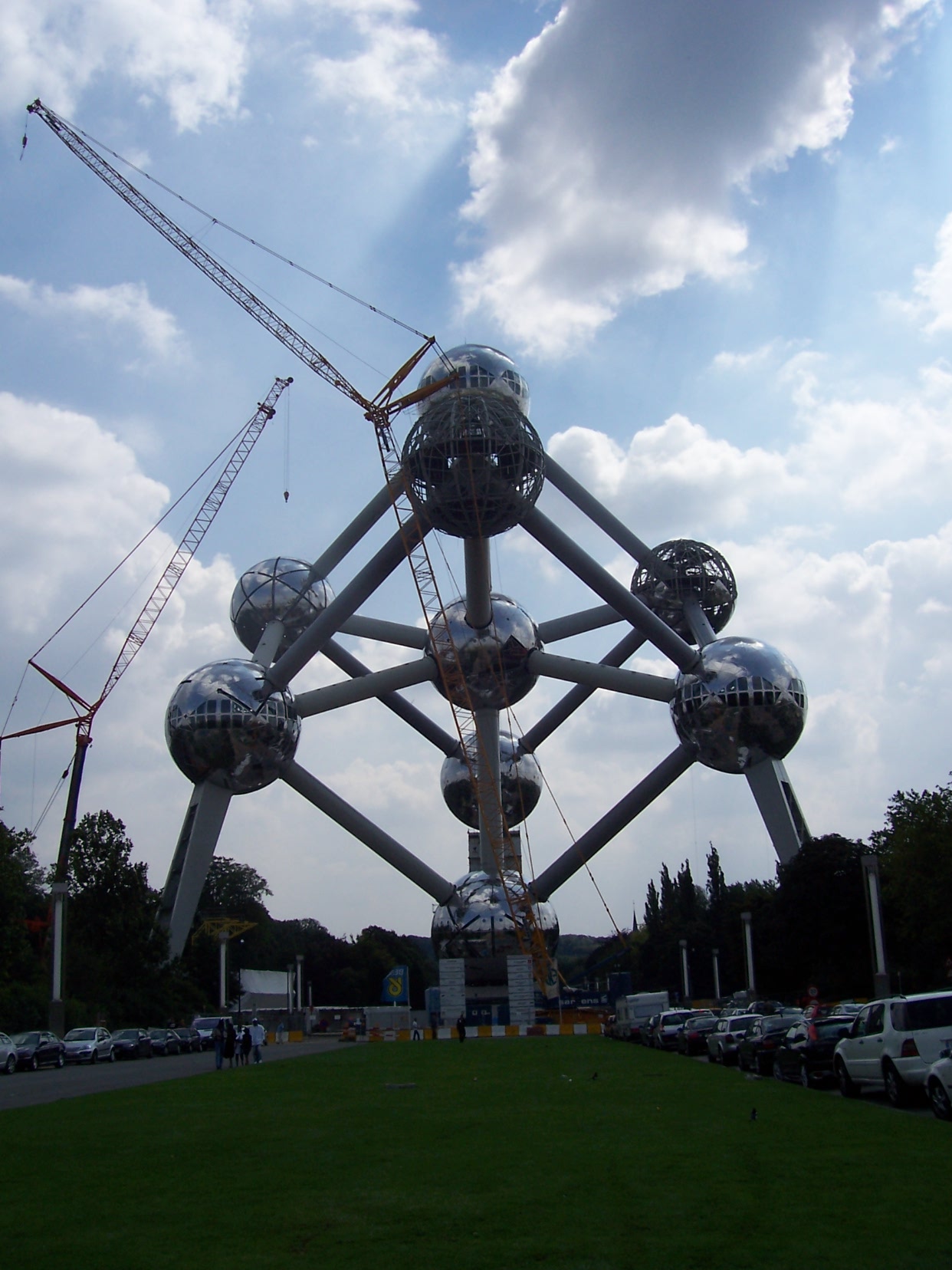 El AtomiumEste raro edificio (porque es eso, un edificio) se construyó para la Exposición Mundial de Bruselas, celebrada en 1958, y fue diseñado por el ingeniero André Waterkeyn.Sorprende darse cuenta, a mí me pasó, al menos, de que se trata de un cubo al que se le han añadido nueve esferas, una en cada vértice y una más en el centro. Los cilindros que unen las esferas son las aristas y diagonales del cubo. Tal como está colocado genera unas perspectivas que lo hacen parecer, digámoslo así, más esférico, más átomo redondito con sus electrones y eso. Pero no: es un cubo, y representa una molécula de cristal metálico aumentada 165.000 millones de veces. Otra cosa que me sorprendió es el tamaño, del que las fotos nunca hacen justicia: cada esfera tiene 18 metros de diámetro y la más alta alcanza los 110 metros de altura. Os propomgo algunas fotografías: Esta primera es de cuando fui a verlo por primera vez en 2005 y estaba en obras... Las siguientes, como la de la izquierda, son de 2012, con la obra terminada: Para terminar, no me resisto a incluir esta imagen del monasterio de El Escorial en versión atómica y con la torre Eiffel de silenciosa acompañante: