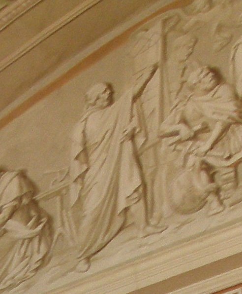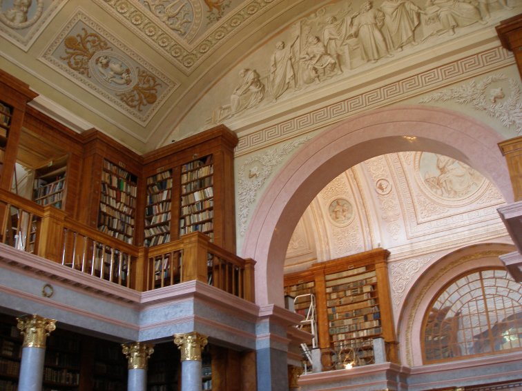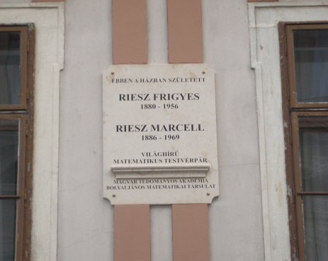 La biblioteca de la abadía de PannonhalmaAl sur de la ciudad húngara de Gyor se encuentra la abadía de Pannonhalma. Situada en una colina, su alta torre da muy bien sobre la espesura, que no es cualquier cosa, sino un importante y frondoso arboreto. La visita empieza mal: un vídeo de quince minutos hace propaganda del monasterio y sus monjes así como de sus variados negocios. Sin embargo, el lugar guarda una joya, una pequeña basílica gótica de esas que a uno le trasportan al mundo y la época de El nombre de la Rosa. También llama la atención su biblioteca que, si bien es nueva, emociona por dedicarle a los libros la ostentación generalmente reservada para otros fines. Si nos fijamos en la parte superior de la fotografía veremos una grisalla con varias figuras. Una de ellas señala con el brazo un dibujo: el tipo es Arquímedes y lo que señala un esquema del teoréma de Pitágoras. En dicho esquema (ver detalle) sobre los lados del triángulo no aparecen cuadrados, sino rectángulos, lo cual puede entenderse como un error o, si los rectángulos son adecuados, como una generalización. En la misma Gyor, además de su impresionante belváros, se puede encontrar una placa en honor de los hermanos Riesz.
